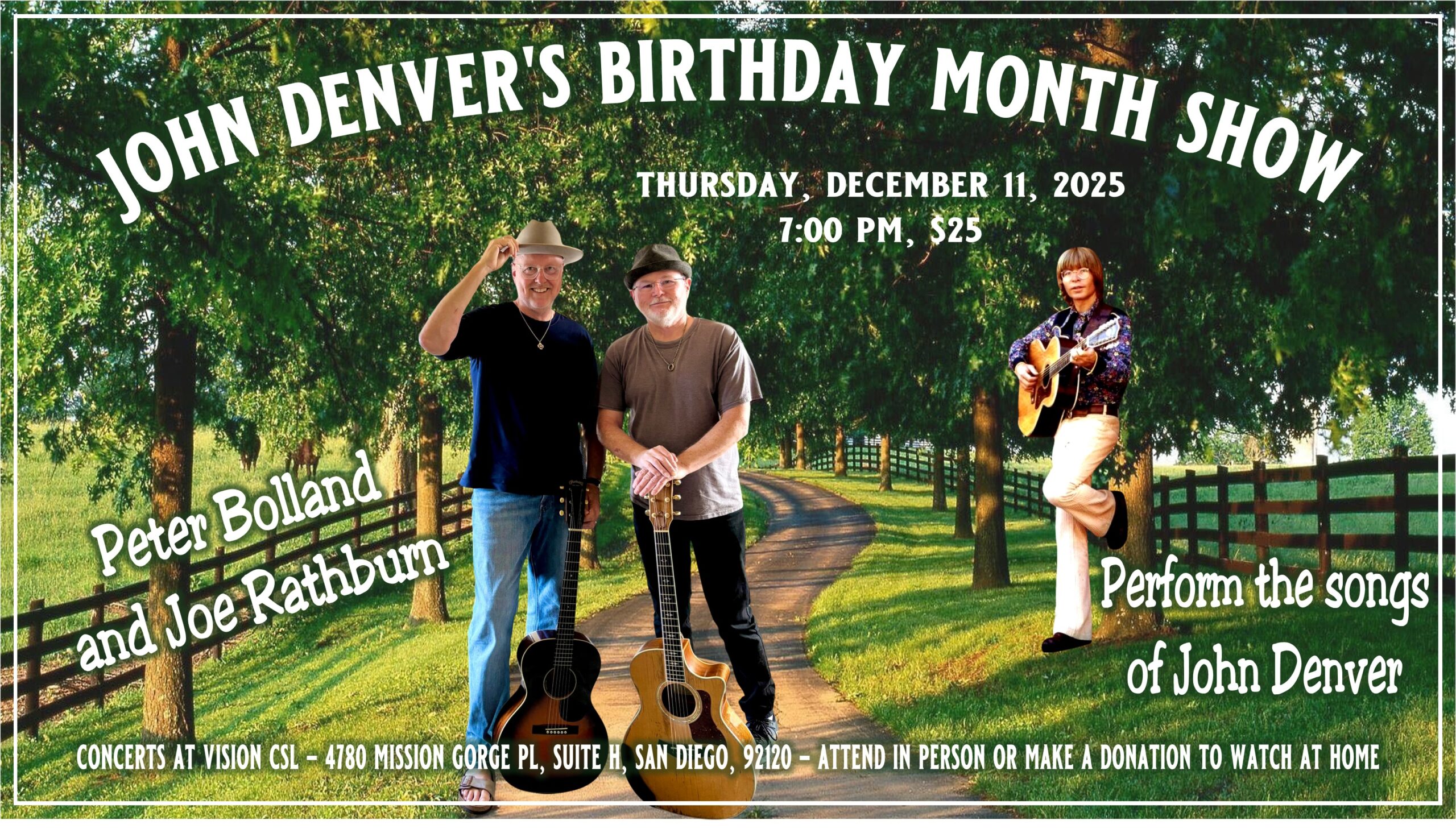 Vision Mission Valley 4780 MISSION GORGE PLACE, SUITE H, SAN DIEGO, CA, United StatesSpecial EventsPeter Bolland and Joe Rathburn are getting together again for their annual John Denver tribute. This concert is so much fun and you can sing along to so many songs.Thursday, December 11th @ 7:00 pmSeats $25 Click Here To Purchase Tickets
