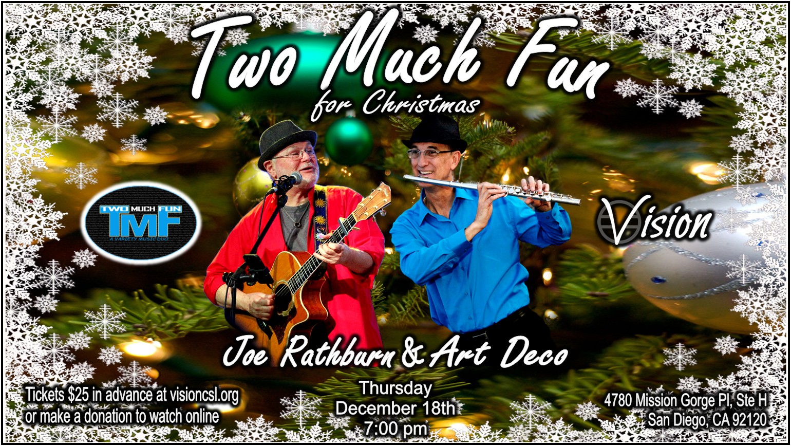 Vision Mission Valley 4780 MISSION GORGE PLACE, SUITE H, SAN DIEGO, CA, United StatesSpecial EventsJoe and Art have been friends and bandmates for many years and look forward to reuniting for this special seasonal show of many or their, and hopefully your, favorite Christmas songs. Thursday, December 18th @ 7:00 pmSeats $25