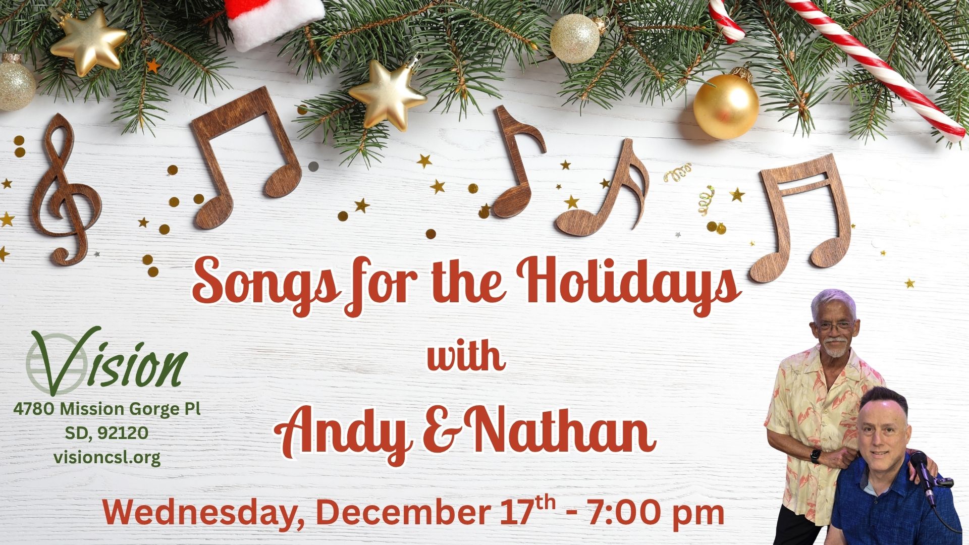 Vision Mission Valley 4780 MISSION GORGE PLACE, SUITE H, SAN DIEGO, CA, United StatesSpecial EventsJoin Andy Anderson & Nathan Fry Andy & Nathan present - Songs for the Holidays Cabaret Concert @ Vision. Wednesday, December 17th at 7:00 pm A&N have been singing together for over 35 years and their blend of singing and entertainment brings joy and creates great memories. We have both seating with tables for you […]