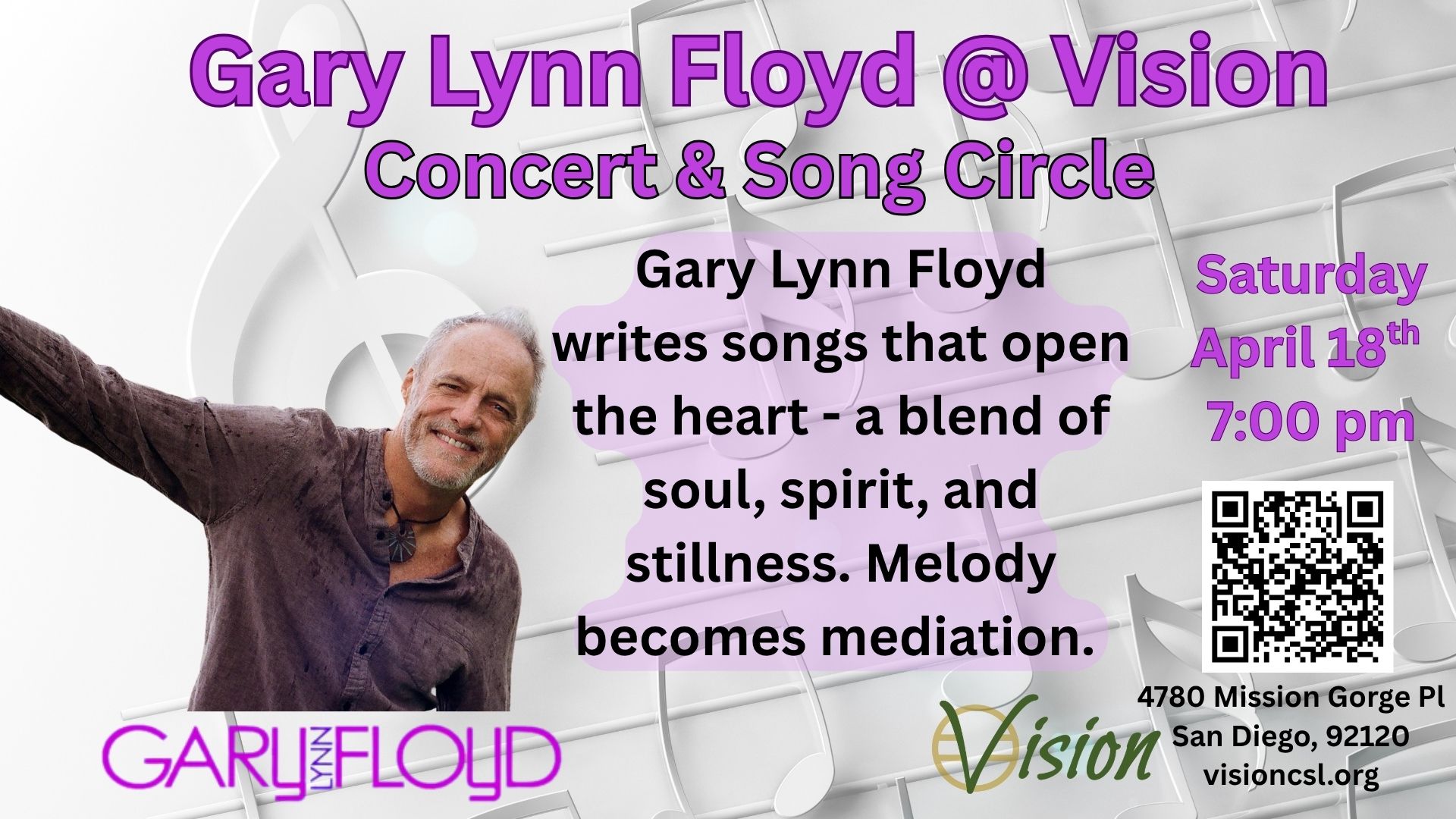 Vision Mission Valley 4780 MISSION GORGE PLACE, SUITE H, SAN DIEGO, CA, United StatesMusic & ConcertsGary Lynn Floyd is a native Texan singer-songwriter who connects straight to the heart and lifts up a room with his inspirational lyrics and soulful style. A self-proclaimed spiritual sponge, he draws for all paths and teachings that resonate with love and depth. With fourteen albums to his name - including The Gospel of Zen, […]