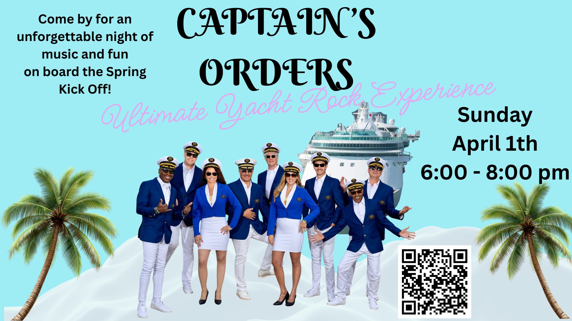 Concert: Captains Orders – Yacht Rock Show Apr 19 Concert: Captains Orders – Yacht Rock Show 6:00 pm - 8:00 pm Music & Concerts