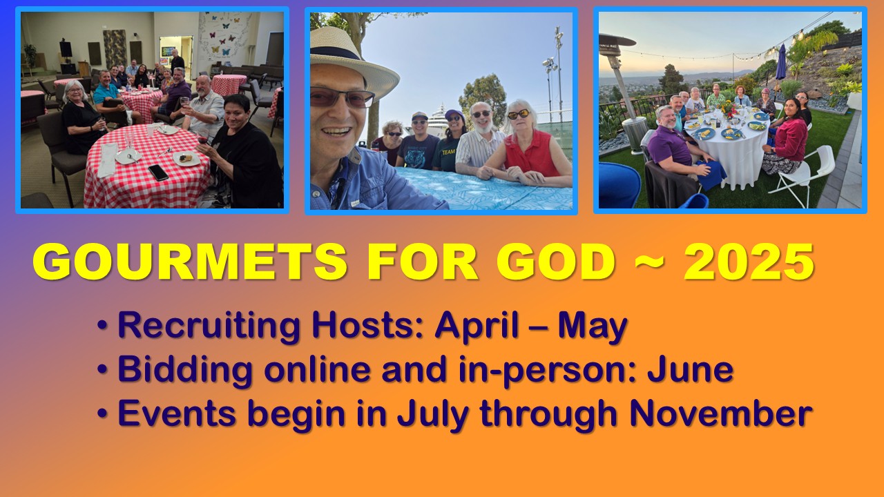 Having enough hosts to provide a variety of dining and/or entertainment events is critical to getting the congregation at large to participate. Simply put, if we don’t have a critical mass of at least 12 events the enthusiasm kind of fizzles out. So let me know how you’d like to participate this year. We plan to organize the events and have them online by the first weekend in June, so you have about a month to get some ideas. If you’re looking for inspiration, I’ve attached the 2025 G4G Auction Booklet from Seattle CSL – I’m not trying to compete (they are a much larger congregation and have been very supportive of me in getting our G4G program back up after our COVID-hiatus), but you can get some great ideas.